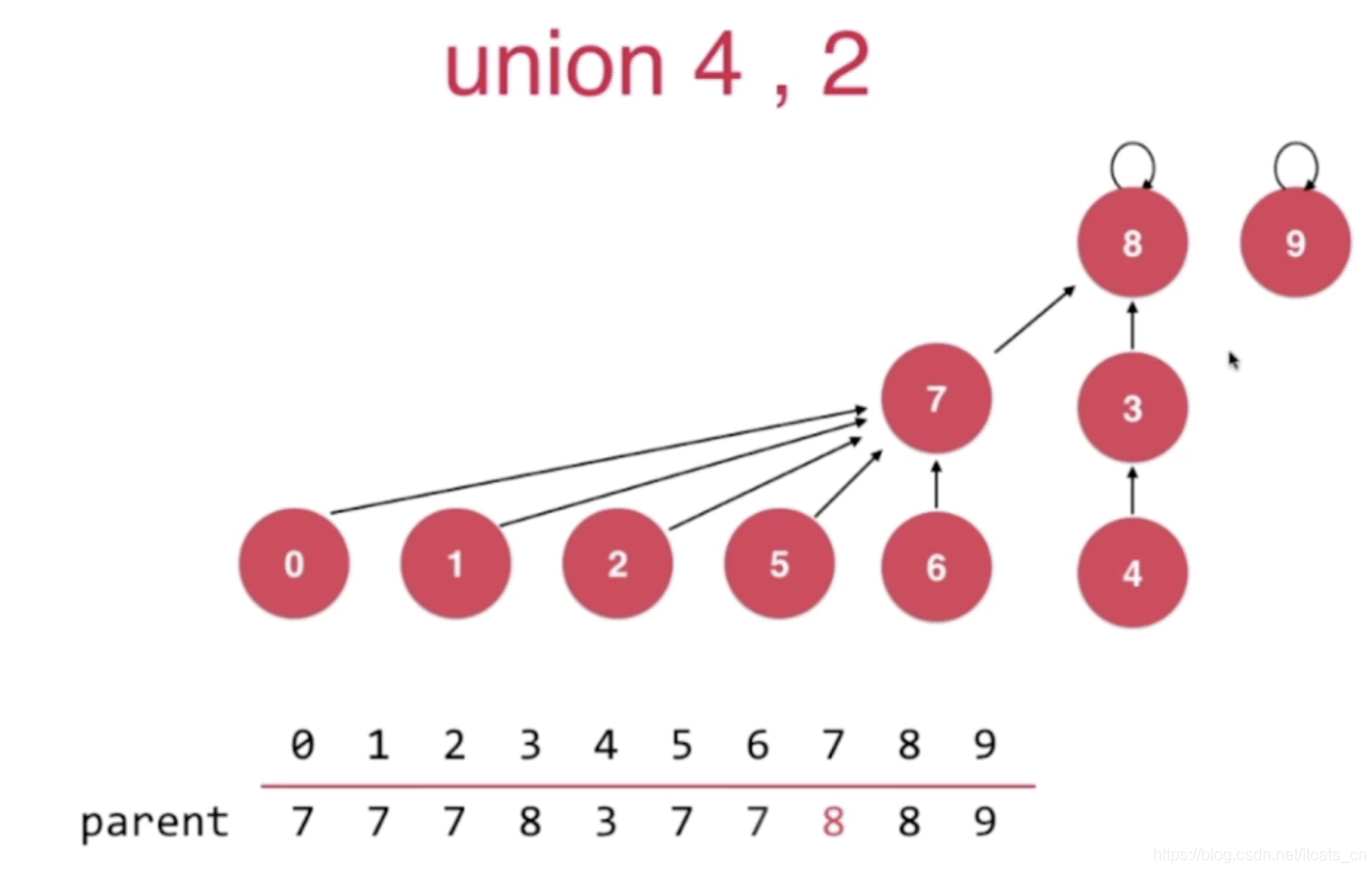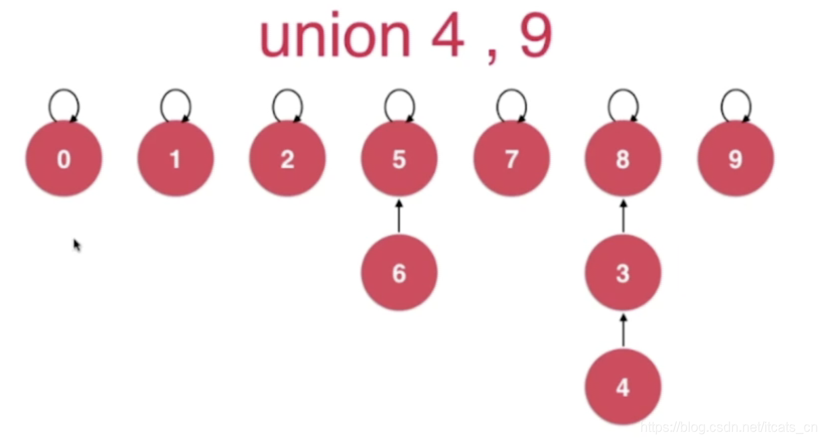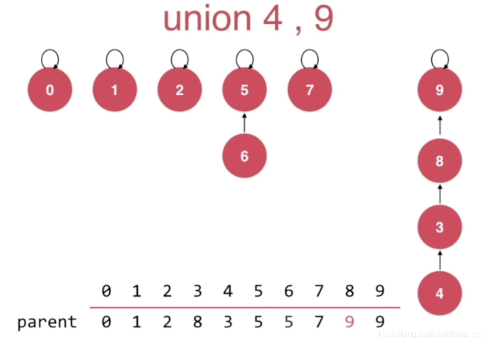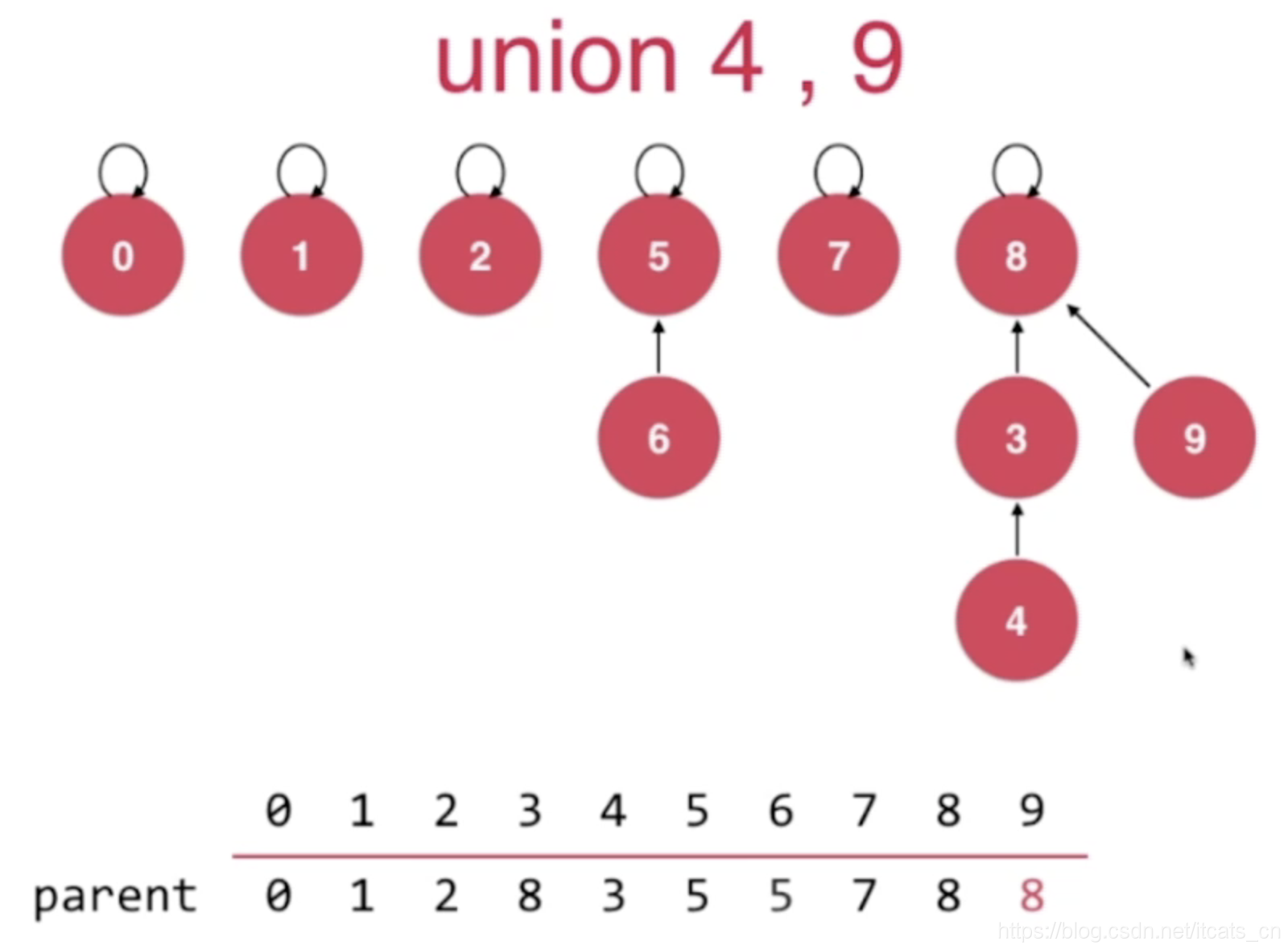 如果我们要union(9,4)的话,实际上就是将9的指针指向节点4所在树的根节点,此时就涉及一个查询操作了,查看上图中的数组图,4指向了3,3指向了8,而8指向了自己,那么就让节点9指向节点8