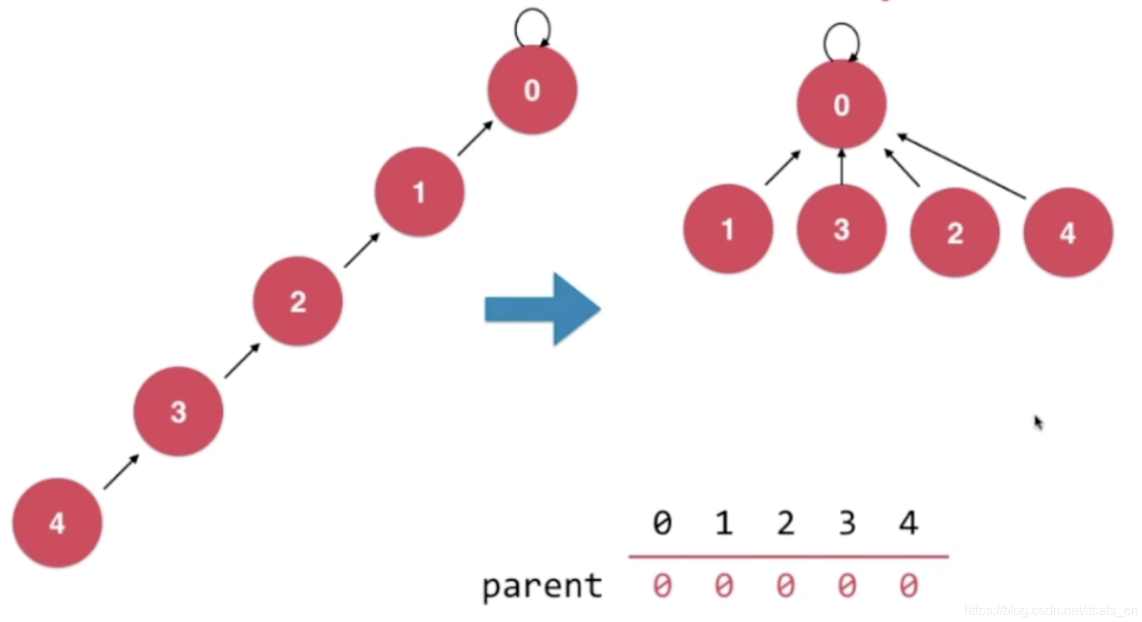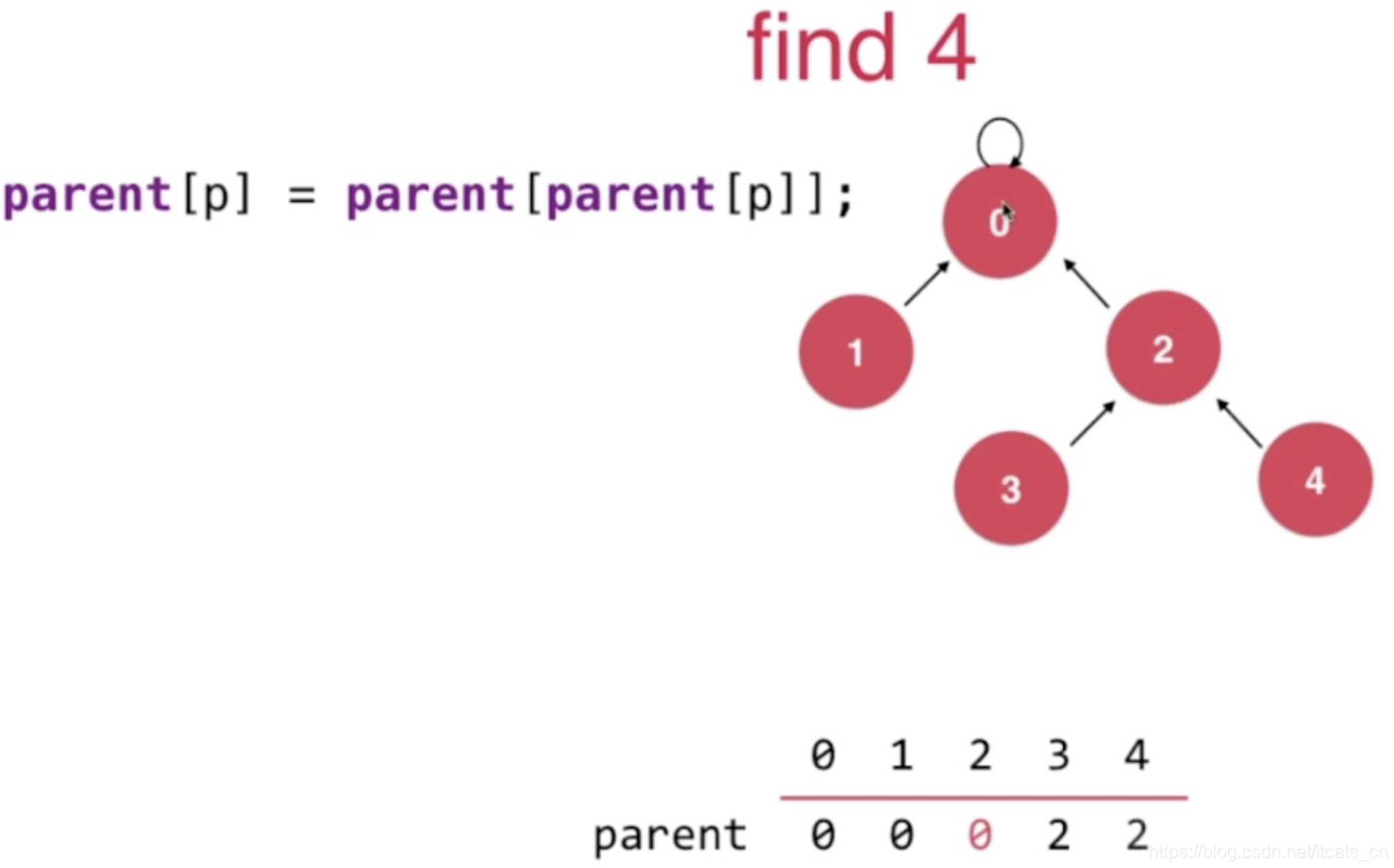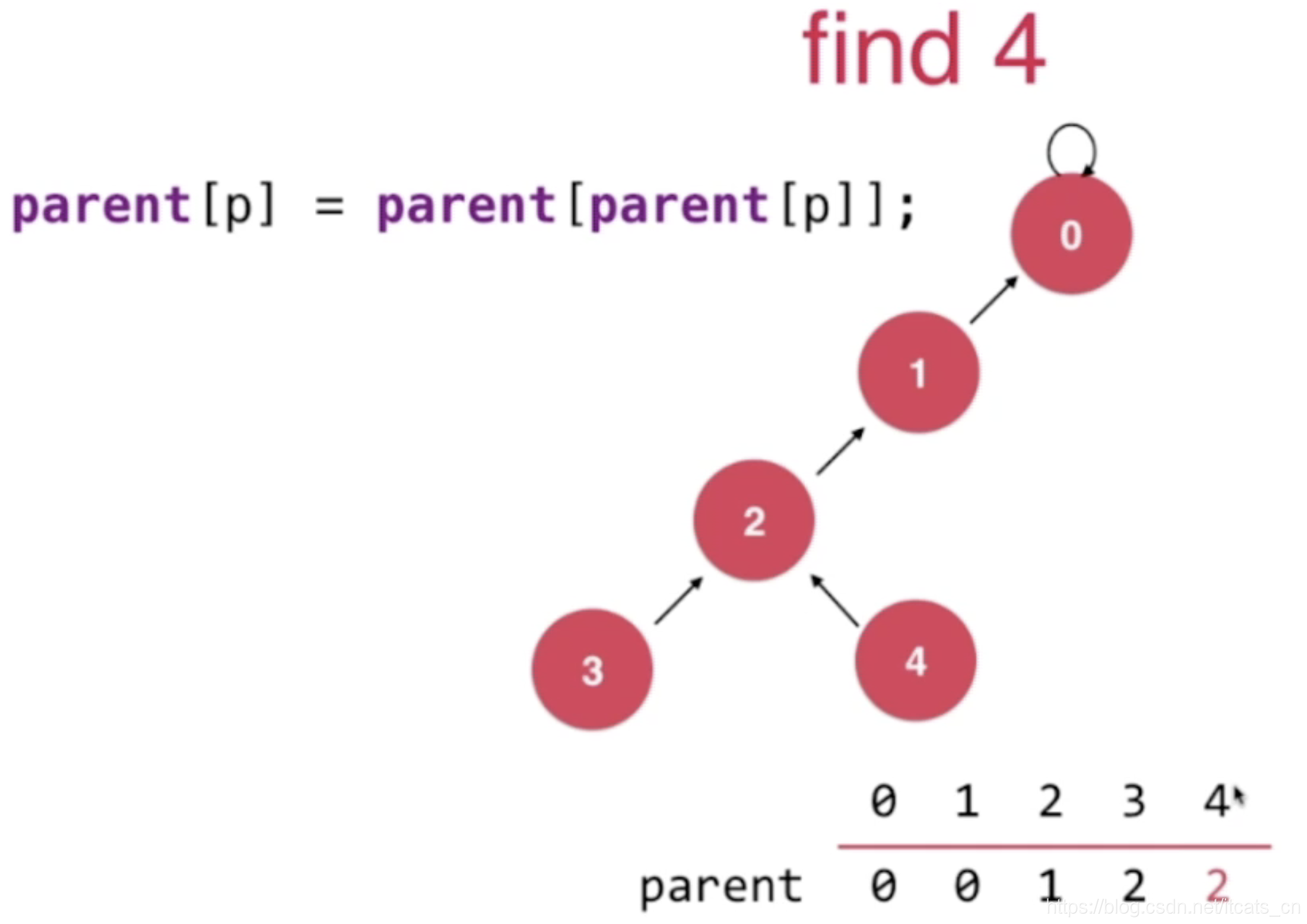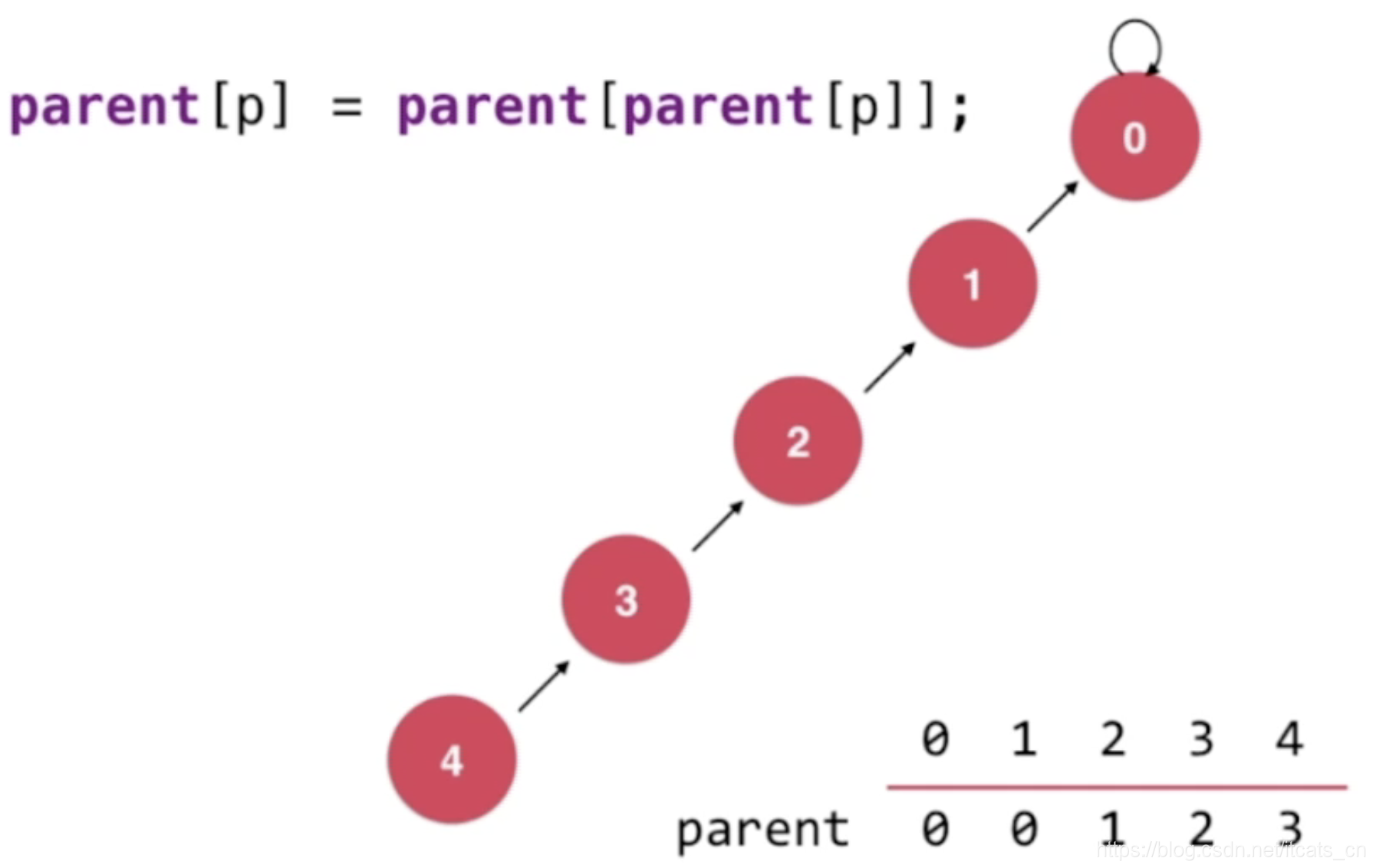 当我们向上遍历的时候执行 parent[p] = parent[parent[p]],即将节点p的父节点设置为节点p父亲节点的父亲节点。