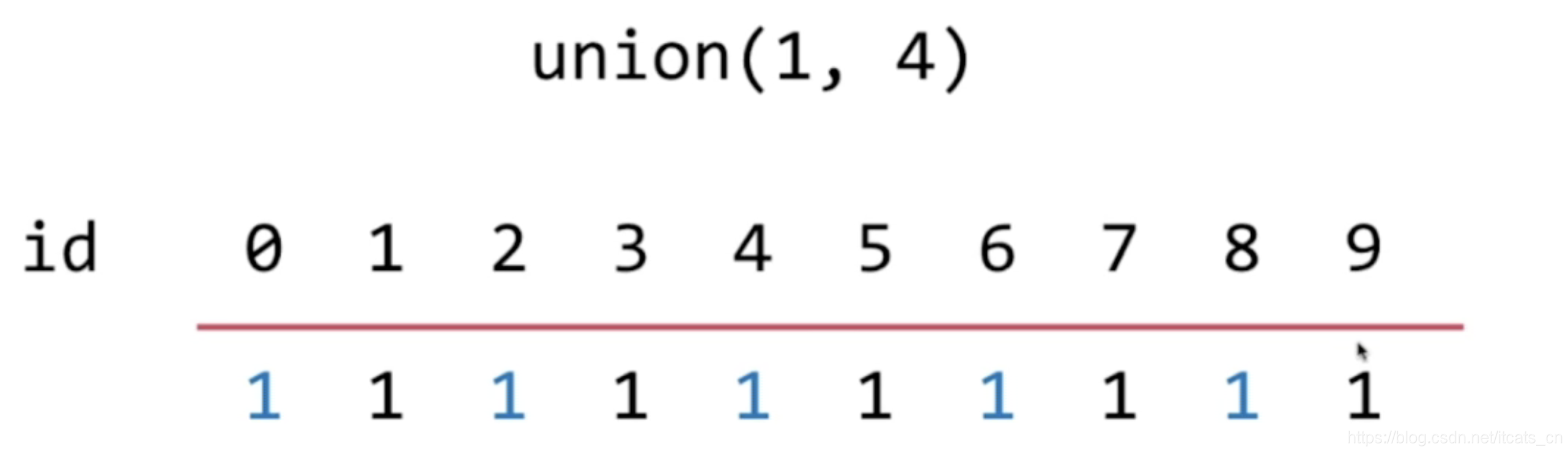 如上图所示,id为单数对应一个集合1,id为双数对应一个集合0,如果我们进行union(1,4),即把集合1与集合2进行合并,变为:
