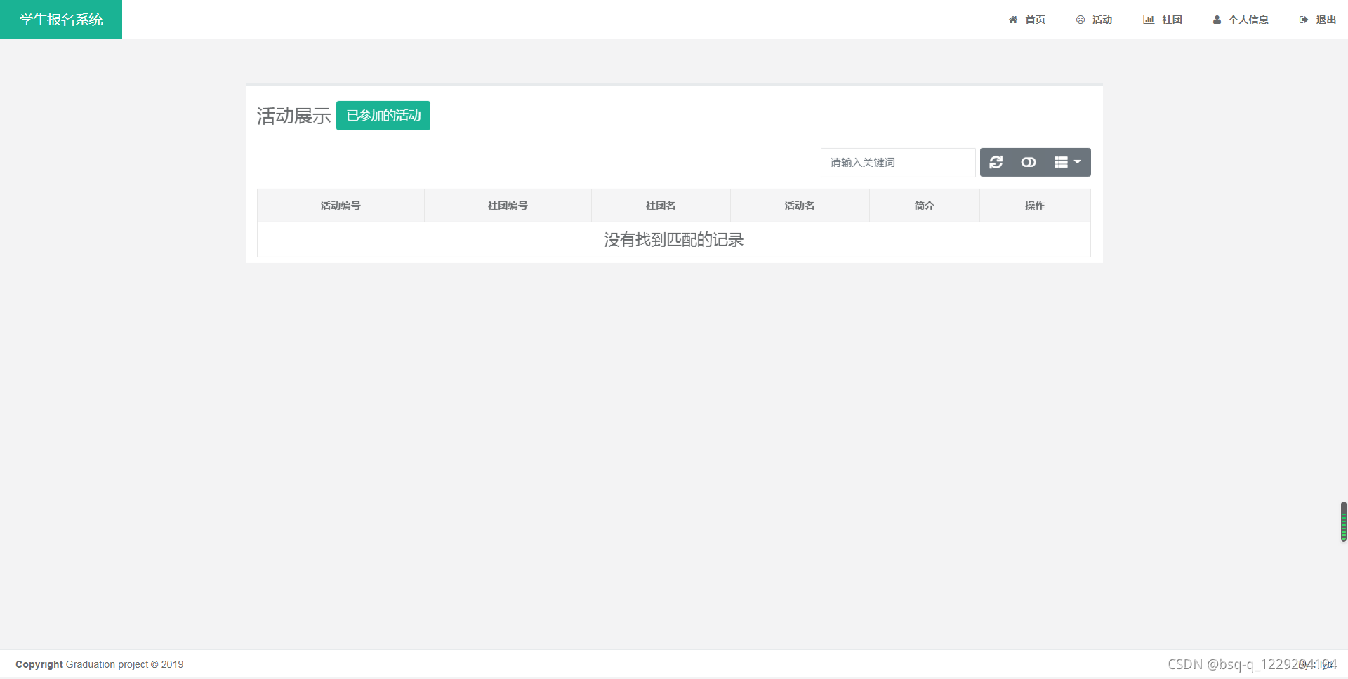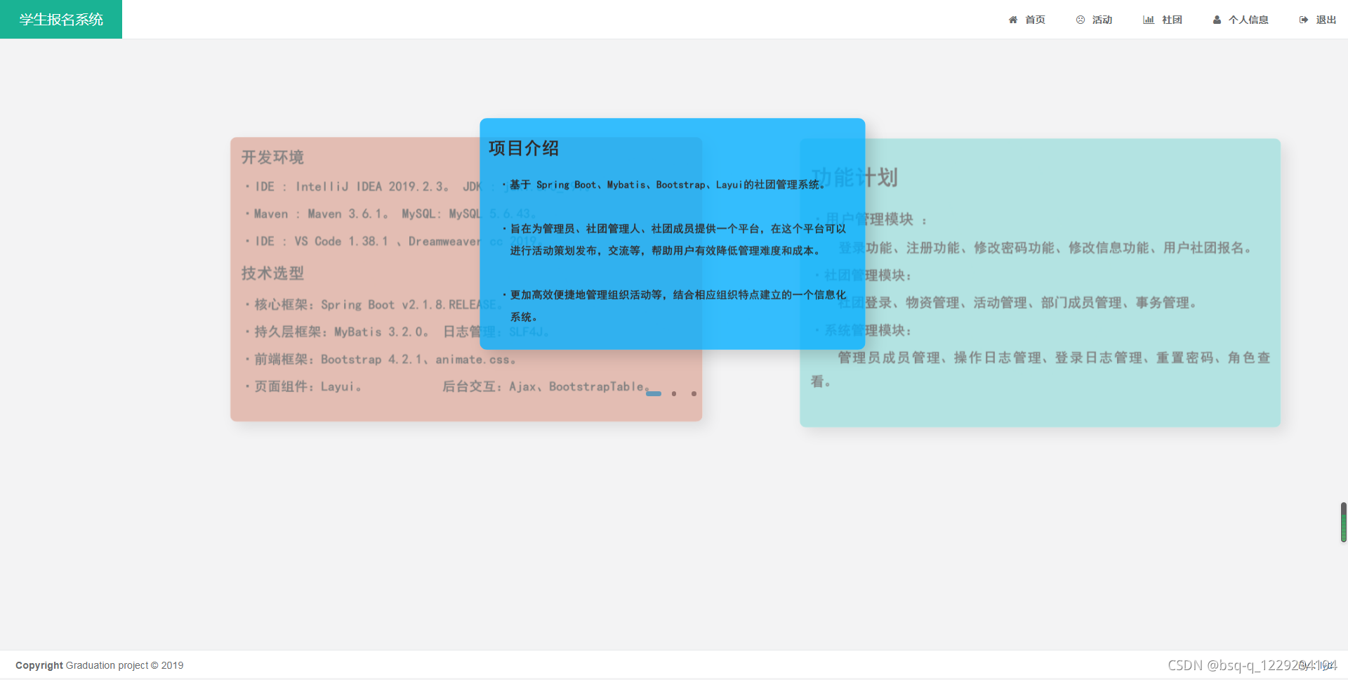 本系统基于SpringBoot和Mybatis,使用MySQL数据库,具备用户管理、社团管理、审核和新闻发布等功能。管理员能进行用户和社团管理,审核信息;用户可注册、登录,查看、加入社团并创建活动。