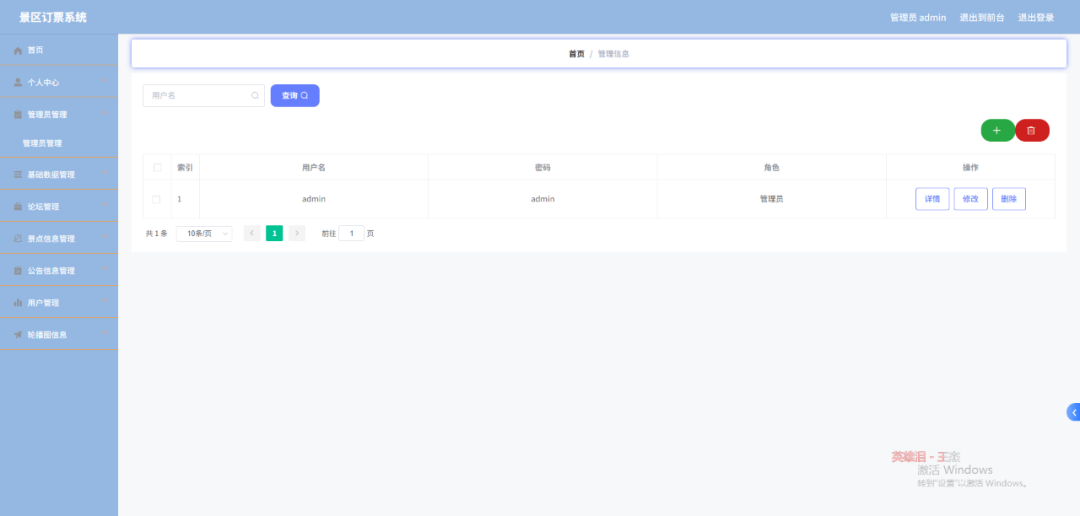 从功能层面来看,该景区门票预定系统涵盖了多方面的核心模块。个人中心模块用于用户管理个人信息与订单;景点类型管理和公告类型管理可对景区资源和通知分类进行规范化维护;景点信息管理与公告信息管理能及时更新景区景点详情和各类公告;论坛管理为游客提供了交流互动的空间;用户信息管理保障了用户数据的有效管理;轮播图管理助力景区展示特色内容;景点留言管理和收藏管理满足了游客反馈与个性化需求;景点预定管理则实现了门票预定的核心流程,各模块协同工作,构建起功能完备的景区票务服务生态。