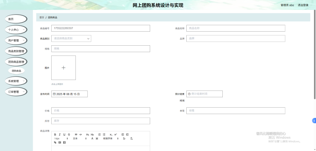 该网上团购系统围绕个人中心、用户管理、商品类别管理、团购商品管理、订单管理、系统管理六大模块构建功能体系。个人中心模块满足用户查看个人信息、订单记录等个性化需求;用户管理模块实现对用户信息的各类操作,保障用户数据的有效管理;商品类别管理模块支持商品类别的添加、修改、删除等,便于商品的分类管理;团购商品管理模块可进行团购商品的信息维护与活动管理,助力商家开展团购业务;订单管理模块实现订单的全流程管理,确保交易的顺利进行;系统管理模块负责系统基础数据与配置的管理,保障系统的稳定运行。通过这些功能,全方位覆盖用户团购消费、商家运营管理的各项需求,提升团购交易的效率与体验。