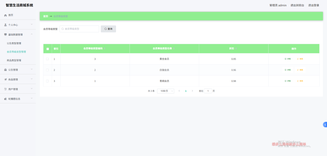 在智慧生活商城系统中,管理员拥有多维度的后台管理权限,可对公告、用户信息、商品信息执行增删改查操作,同时能回复用户对商品的评价,并全面管理商品订单、商品留言及商品退货等信息,确保系统运营规范有序;而用户则可在前台开展购物相关操作,包括购买商品、管理收货地址、查看个人购买的商品信息与平台公告、管理购物车,以及对需退货的订单商品提交退货申请,满足日常购物与售后需求。