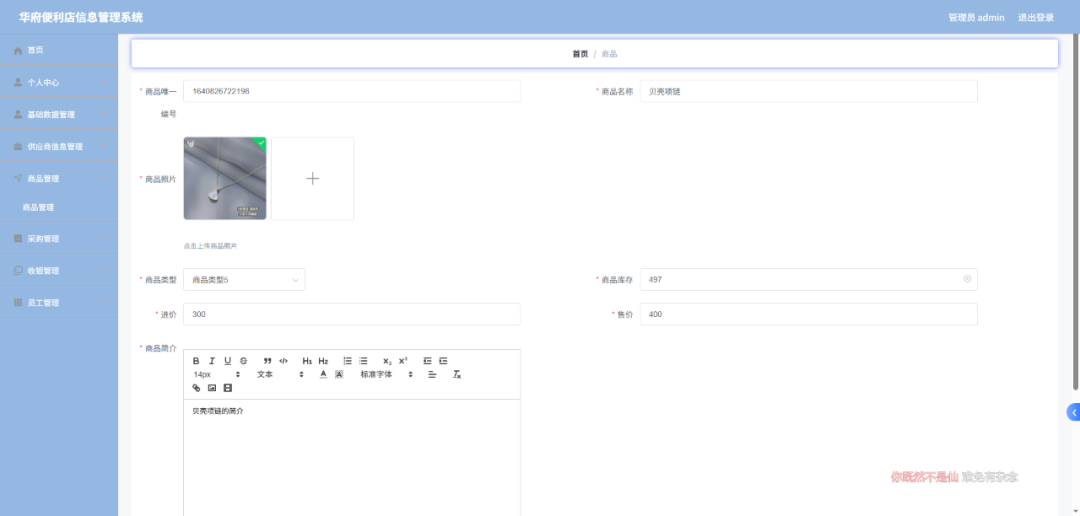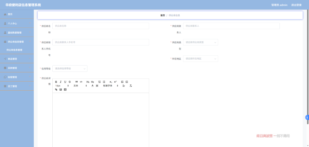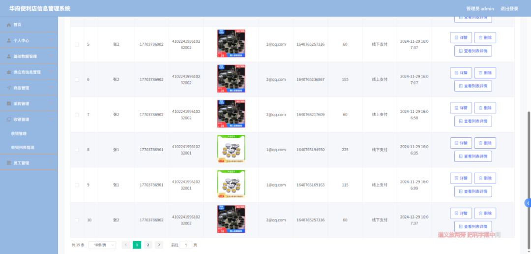 从操作维度看,系统围绕“增、改、删”三类核心操作,覆盖多类对象。对于个人,可修改信息和密码;针对商品,能新增、修改、删除商品条目;采购方面,可对采购相关信息执行新增、修改、删除;收银场景下,能对收银记录进行新增、修改、删除;员工管理中,可新增、修改、删除员工信息;供应商管理里,可新增、修改、删除供应商信息,全面满足便利店信息管理需求。。
