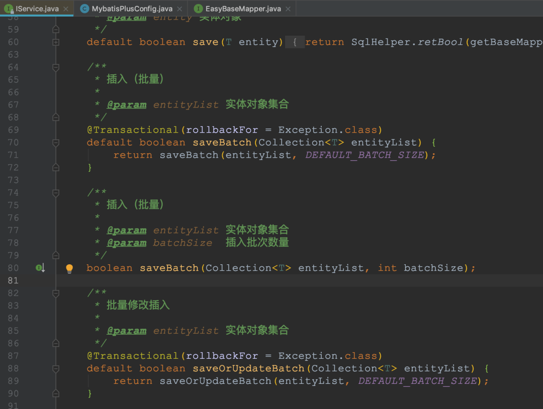 com.baomidou.mybatisplus.extension.injector.methods.InsertBatchSomeColumn包中其实是有很多插入代码实现的,这里我就不贴标签了,大家自行跟踪一下。我们来手工扩展一下: