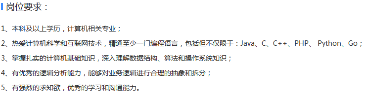 2、热爱计算机科学和互联网技术,精通至少一门编程语言,包括但不仅限于:Java、C、C++、PHP、 Python、Go;