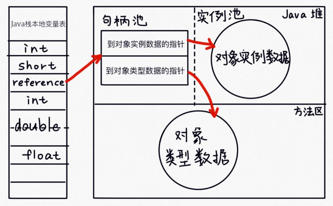 句柄访问会在 Java 堆中划分一块内存作为句柄池,每一个句柄存放着到对象实例数据和对象类型数据的指针。