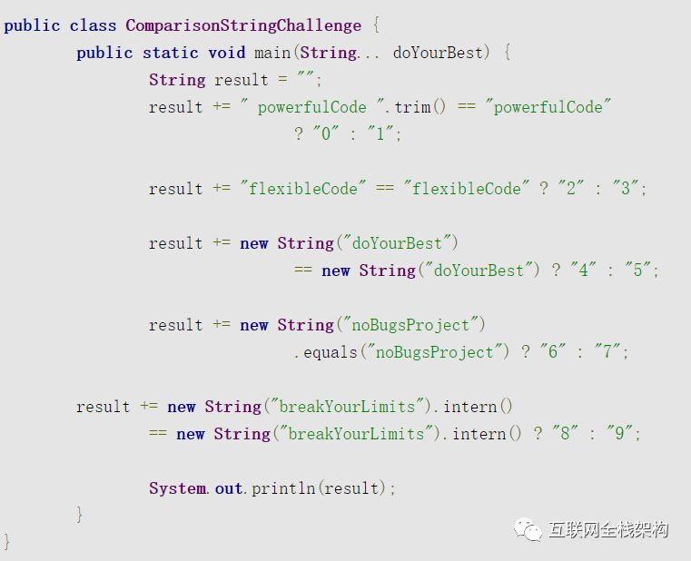 就像你之前看到的那样,intern()方法把字符串放到了字符串池中。两个字符串都指向了同一个对象,所以这个例子中的比较返回了true。