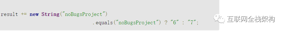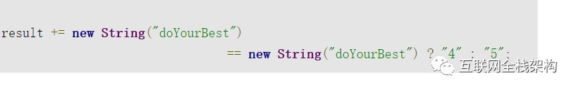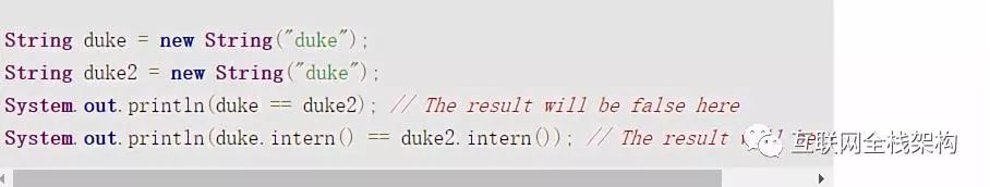 基于前面的样例代码,你可能会认为这段代码会返回true,但它确实是fasle。添加了new操作符,强制在堆内存中创建一个新的String。因而,JVM创建两个不同的对象。