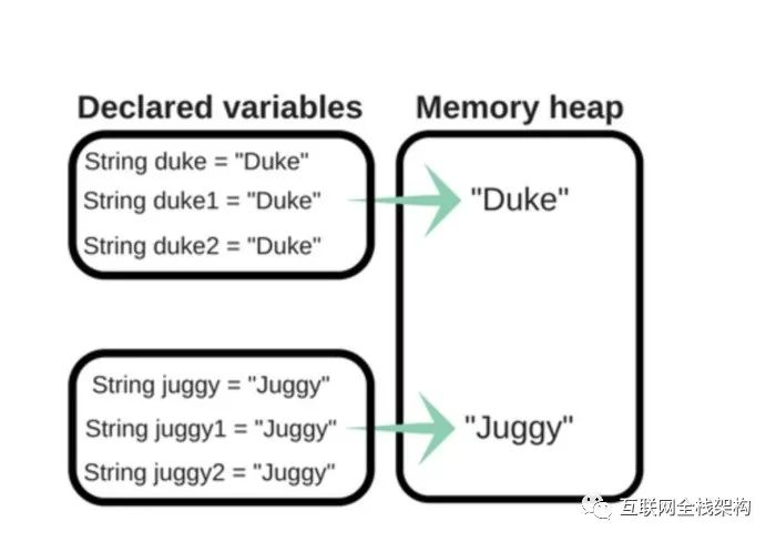 String可能是Java中用得最多的类了。如果每次我们使用一个String的时候,都在堆内存中创建一个新的对象,我们可能会浪费很多内存。对于每个字符串的值,字符串池都只保存了一个对象,通过这样的方式来解决上述问题,如下图所示: