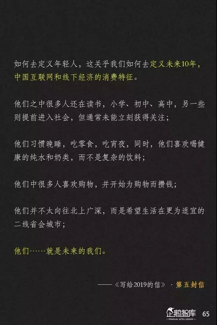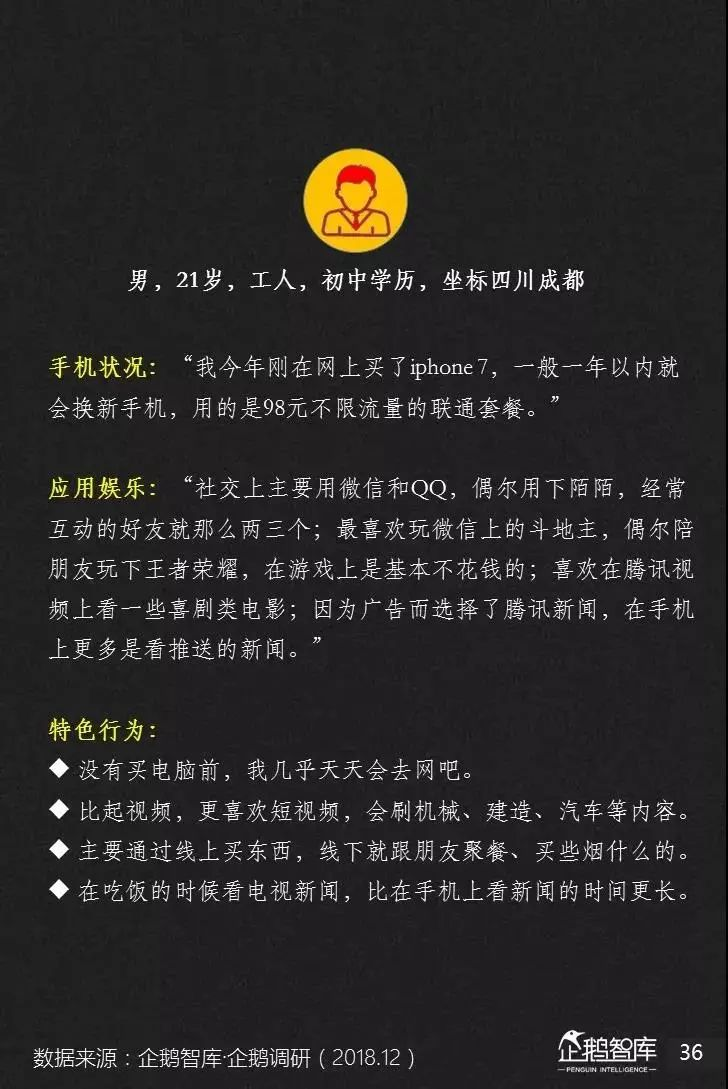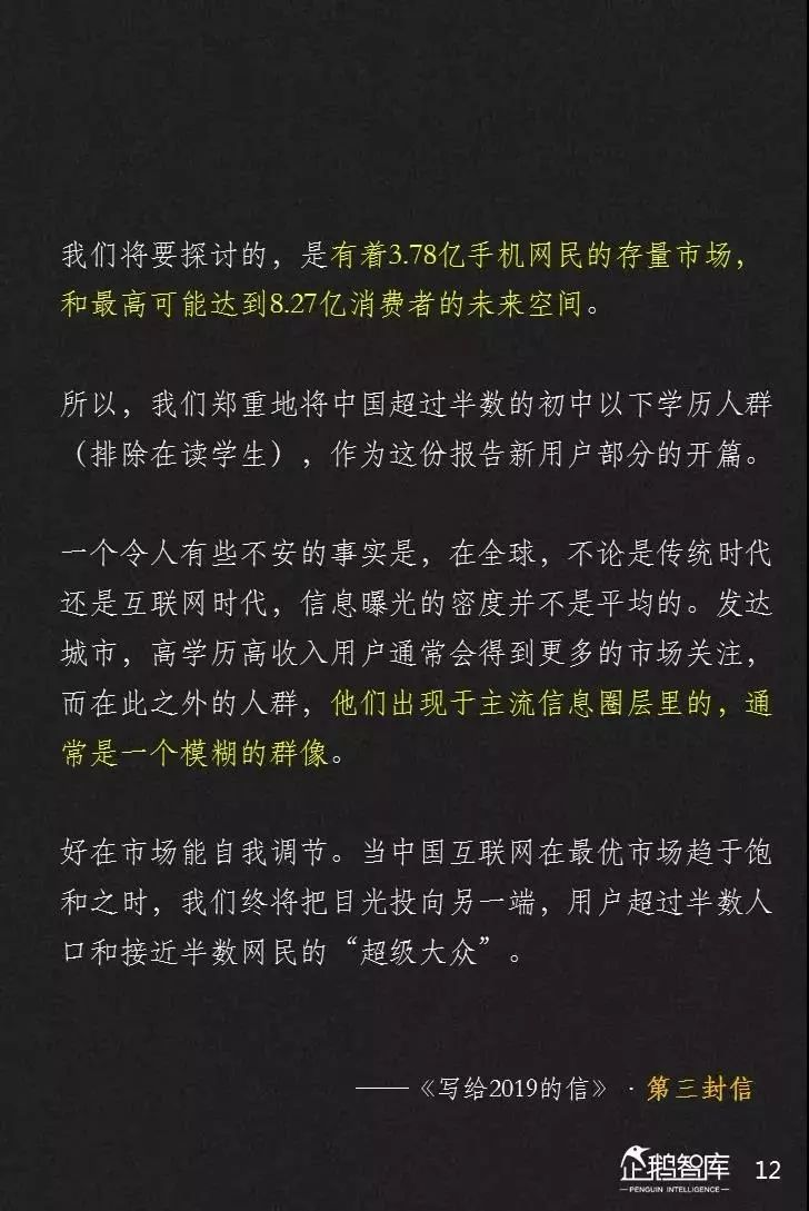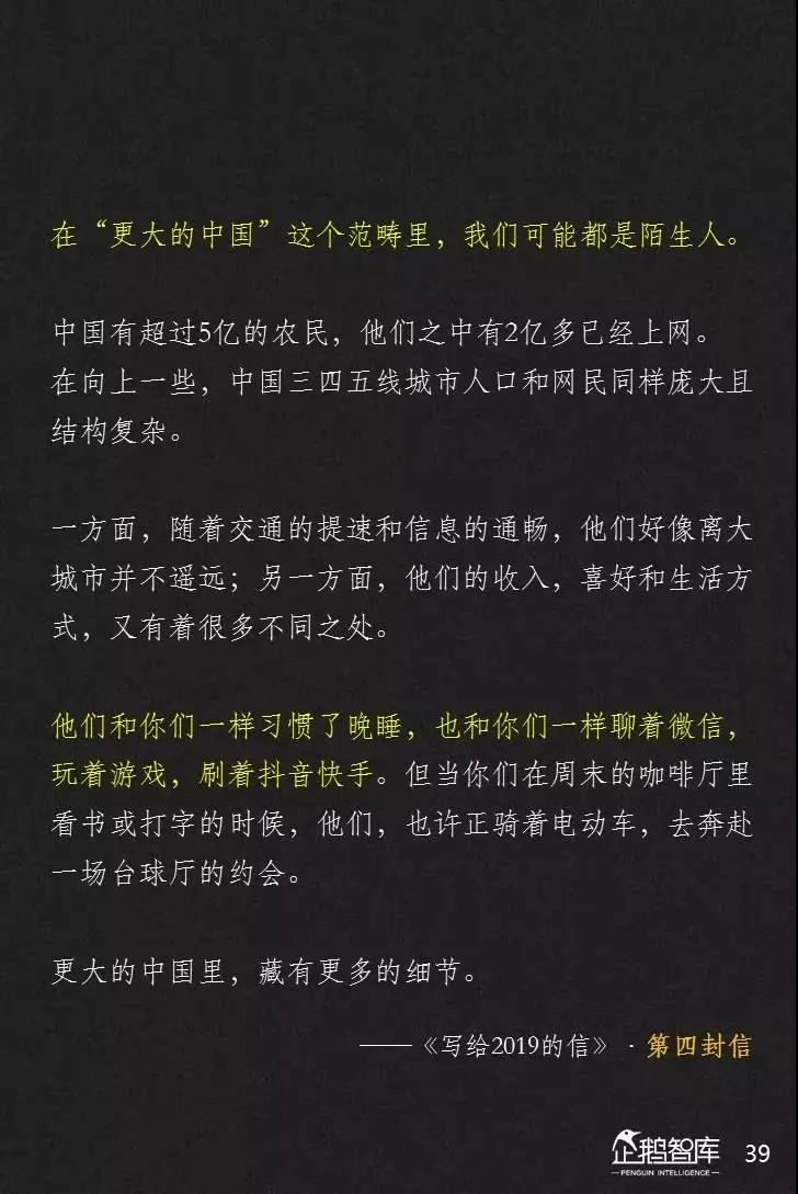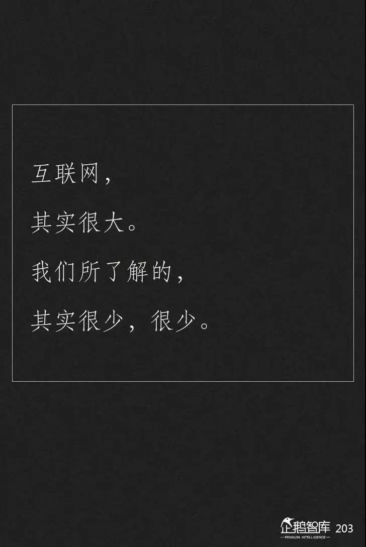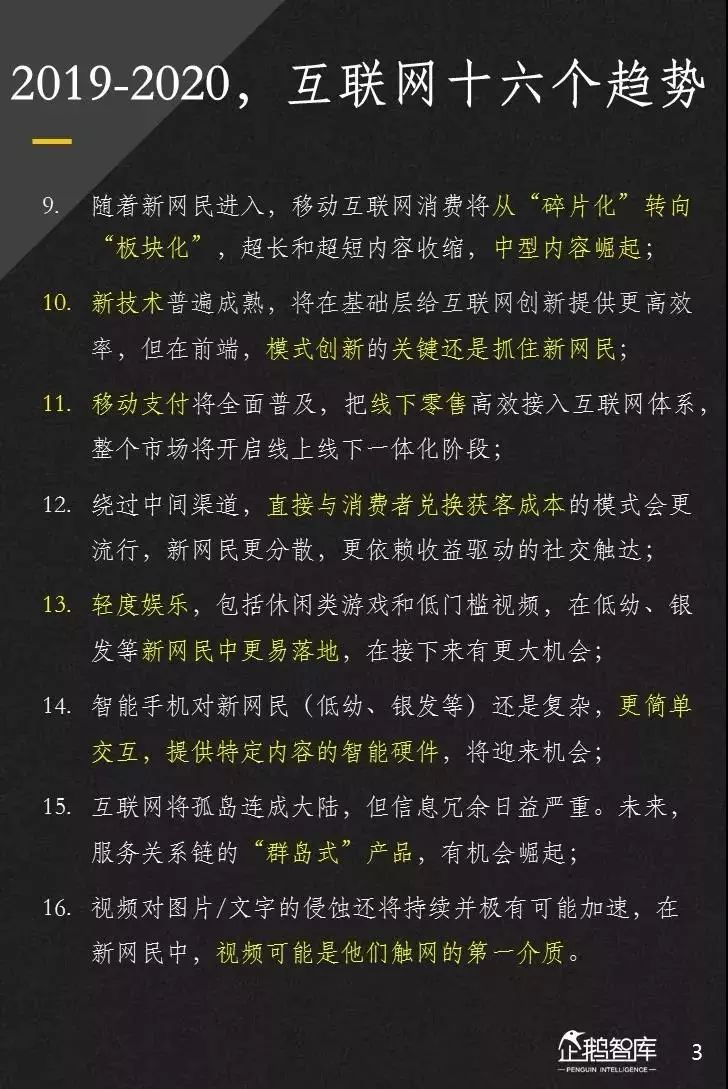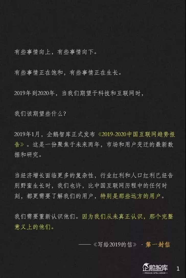 2019年1月,腾讯·企鹅智库正式发布长达205页的《2019-2020中国互联网趋势报告》。这是一份聚焦于未来两年,市场和用户变迁的最新数据和研究。当经济增长面临更多的复杂性,行业红利和人口红利已经告别野蛮生长时,我们也许比中国互联网历程中的任何时刻,都更需要了解我们的用户,更需要重新认识他们。因为我们从未真正认识那个完整意义上的“他们”。