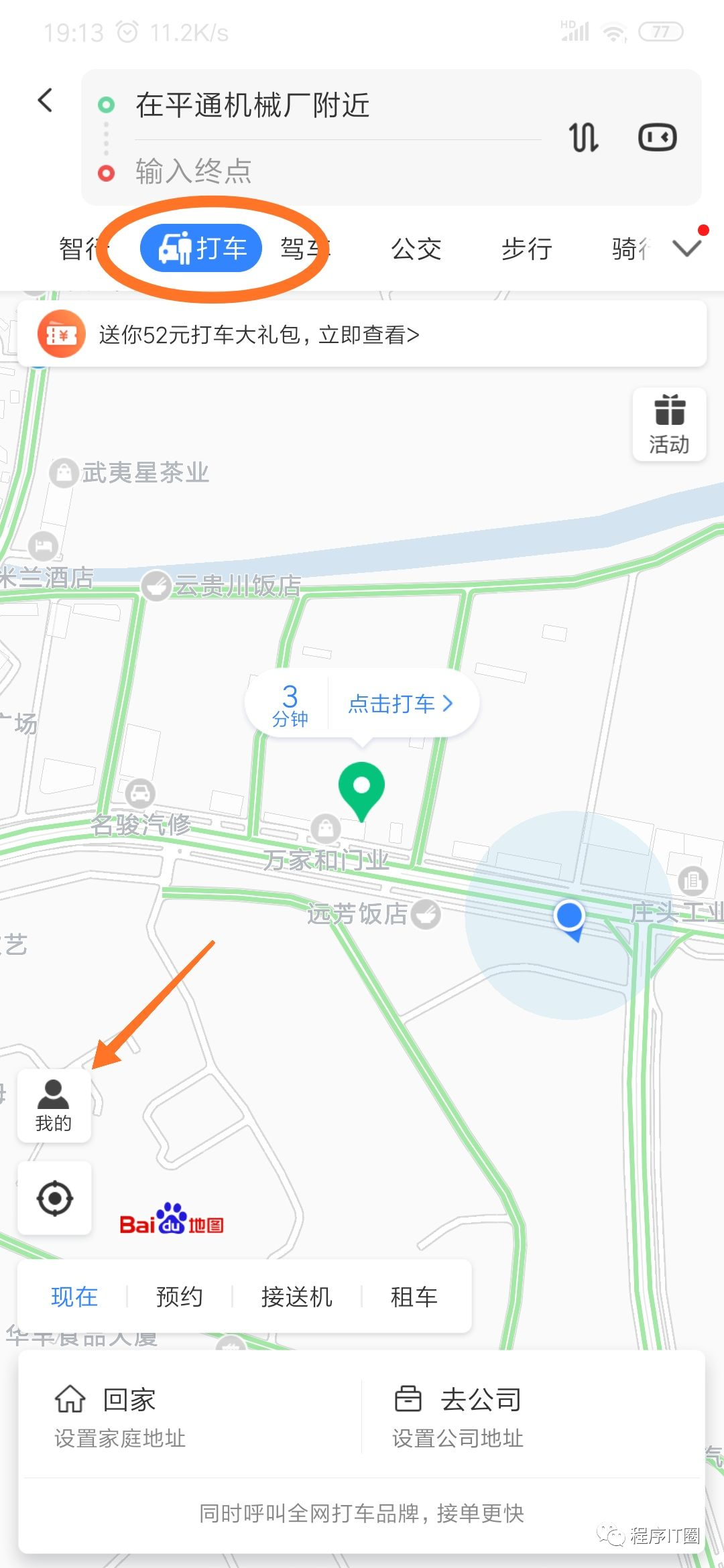 先把百度地图更新到最新版本,选择【打车】— 点击【我】 ,如下图所示: