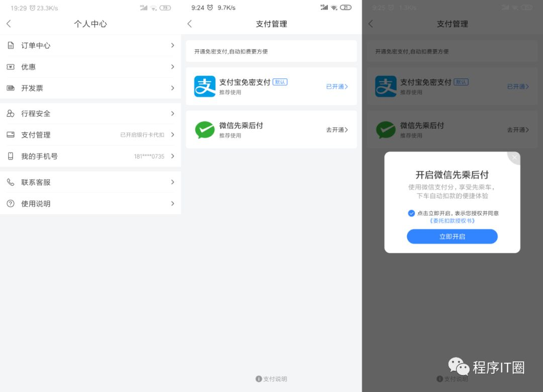 在【我】— 【个人中心】选择【支付管理】,然后选择【微信先乘后付】,点击立即开启。