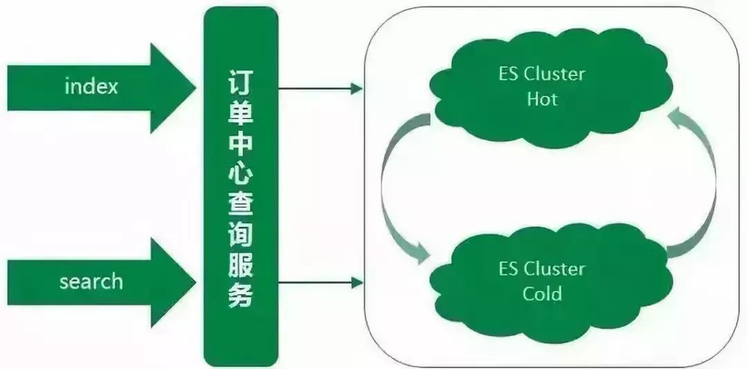 考虑到ES集群暂时没有很好的主备方案,同时为了更好地控制ES数据写入,我们采用业务双写的方式来搭设主备集群。每次业务操作需要写入ES数据时,同步写入主集群数据,然后异步写入备集群数据。同时由于大部分ES查询的流量都来源于近几天的订单,且订单中心数据库数据已有一套归档机制,将指定天数之前已经关闭的订单转移到历史订单库。