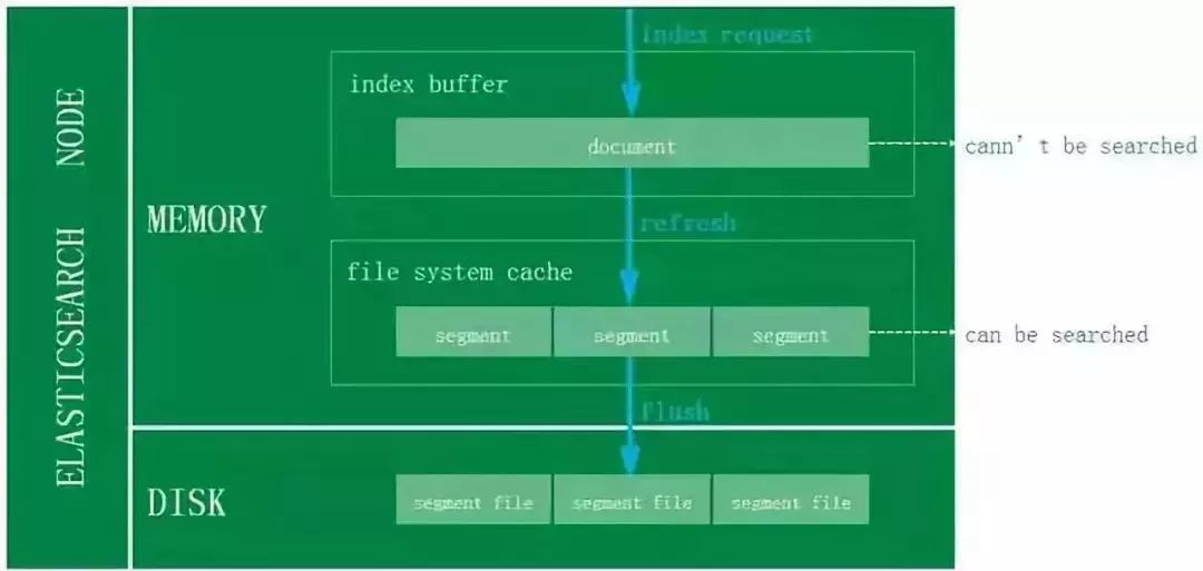 对于ES写入机制的有了解的同学可能会知道,新增的文档会被收集到Indexing Buffer,然后写入到文件系统缓存中,到了文件系统缓存中就可以像其他的文件一样被索引到。