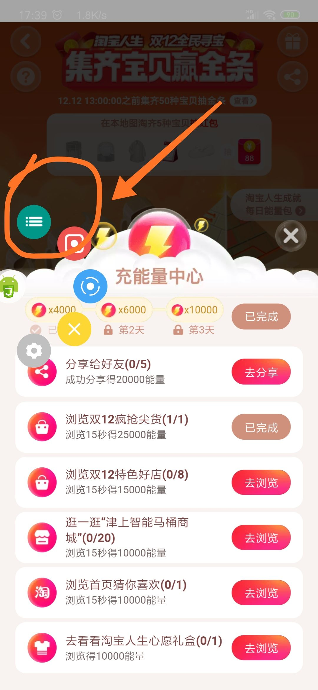 4、打开全民夺宝双12活动页面,进入“充能量中心”子页面后点击屏幕左方的Auto.js悬浮小窗,在弹出的5个小图标中选择第一个,在打开的脚本列表中选择上面第4步导入保存的脚本运行。