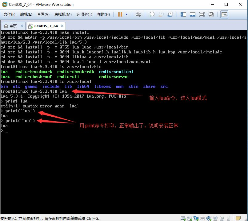 2. 6、最后进行测试,进到Linux的命令行,然后输入lua命令,开始测试。