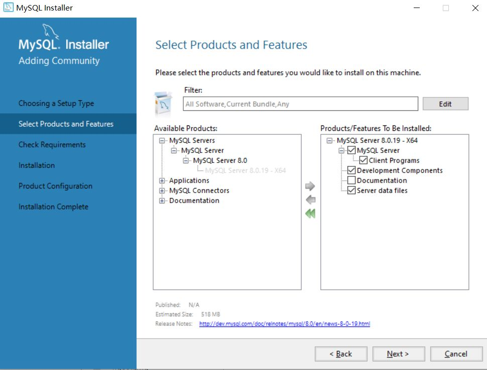 安装能够满足MySQL开发的基本组件,这里选择MySQL Server,如下图所示: