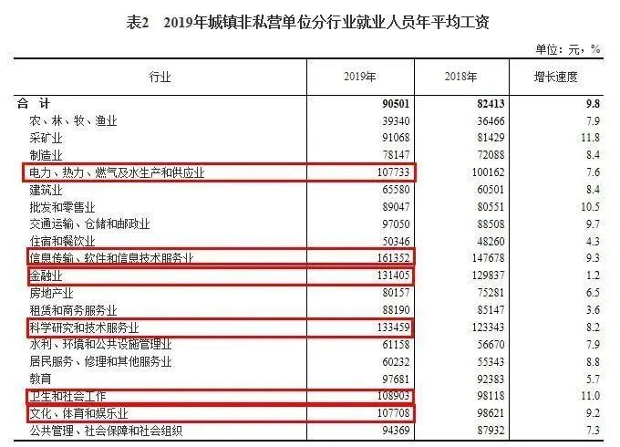 数据显示,金融业增速最低,2019年年平均工资仅增长1.2%。而科学研究和技术服务业年平均工资增速为8.2%。