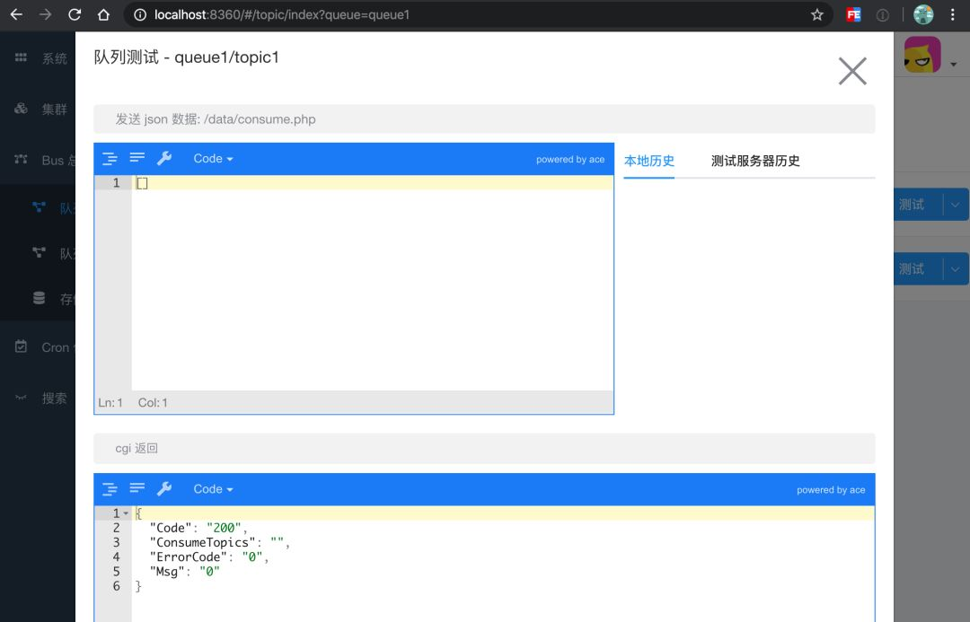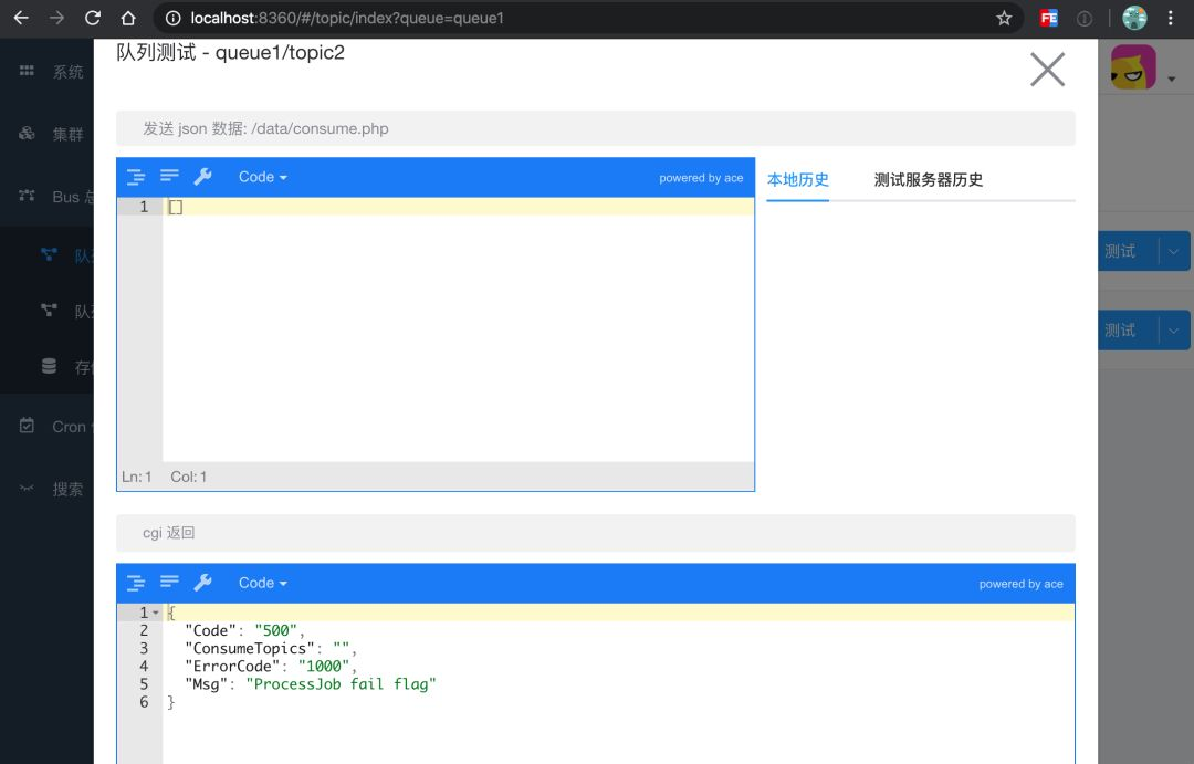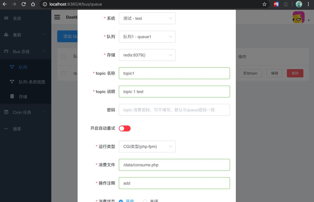 代码仓库中的 example/php/consume.php 已经通过 php 的 SDK 实现了两个消费者,分别为:queue1/topic1, queue1/topic2。其中 topic1 默认返回成功,topic2 默认返回失败。