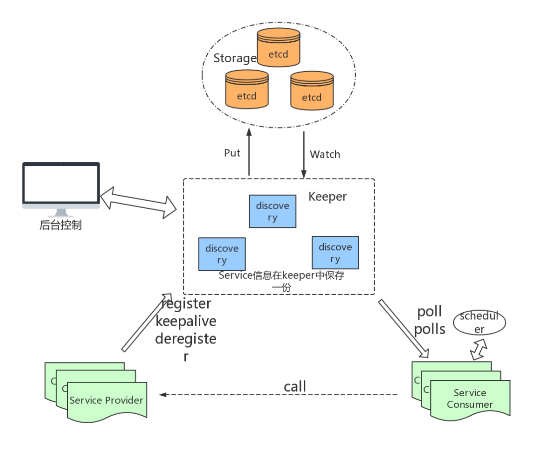 client 端服务注册与发现的接口只与 gokeeper 交互,不关心 gokeeper discovery 后端存储