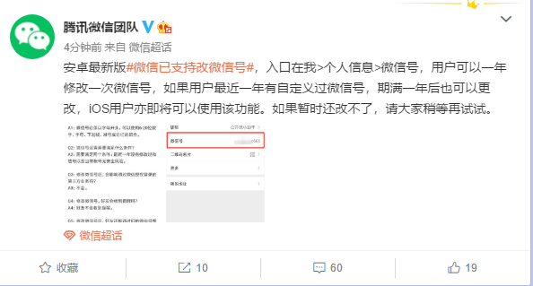 (6月5日),腾讯微信团队宣布,安卓最新版已经支持更改微信号功能,对iOS版本的支持也即将上线。