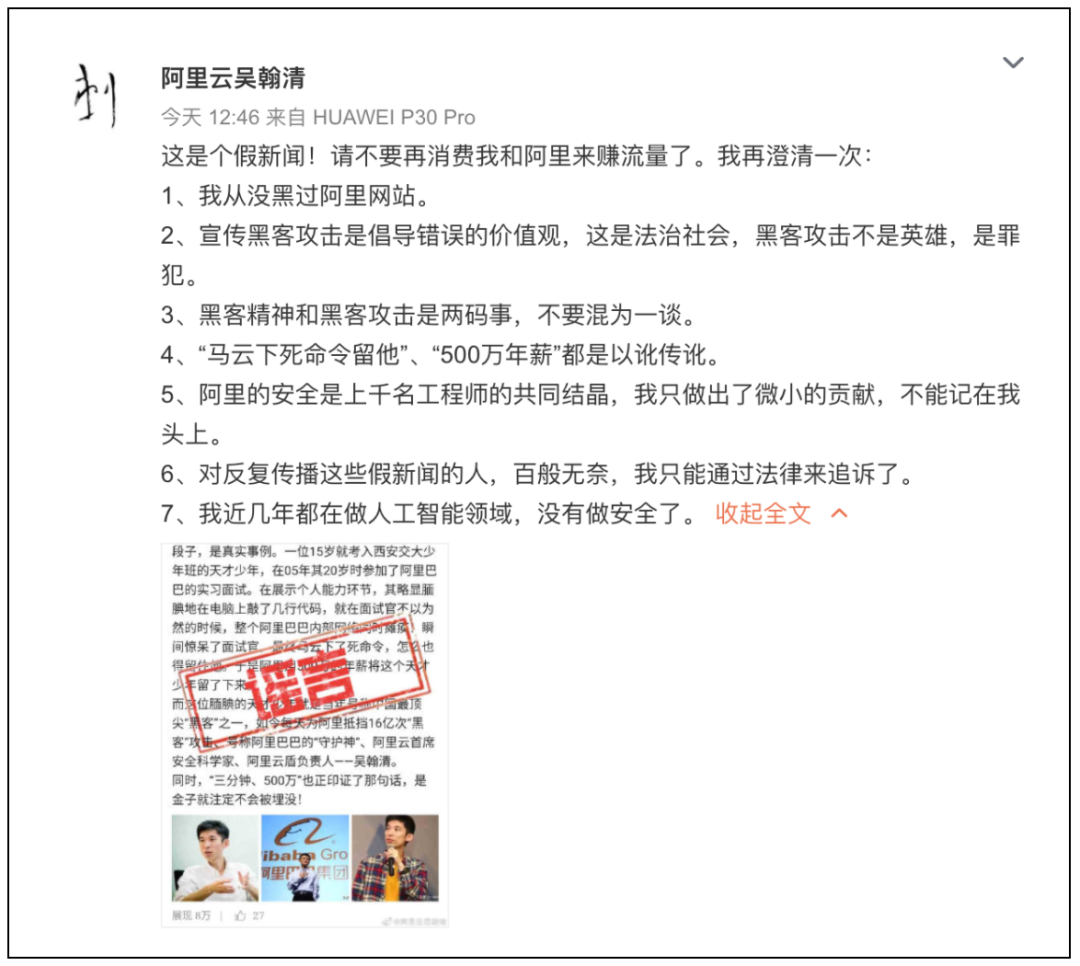 近日,吴翰清在微博上辟谣有关其“黑入阿里网站”、“马云下死命令留他”及“500万年薪”的网络传闻,强调这些都是假新闻,并澄清自己从未进行黑客攻击,且近几年专注于人工智能领域。