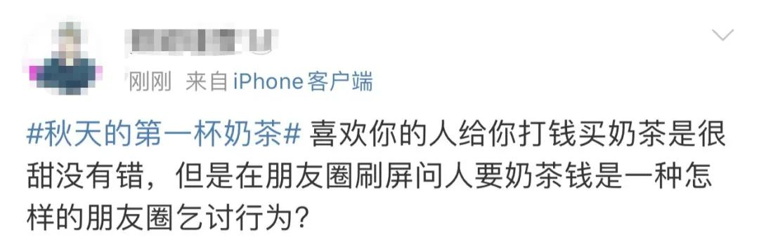 “喜欢你的人给你钱买奶茶很甜没有错,但是在朋友圈刷屏问人要奶茶钱是一种怎样的朋友圈乞讨行为?”