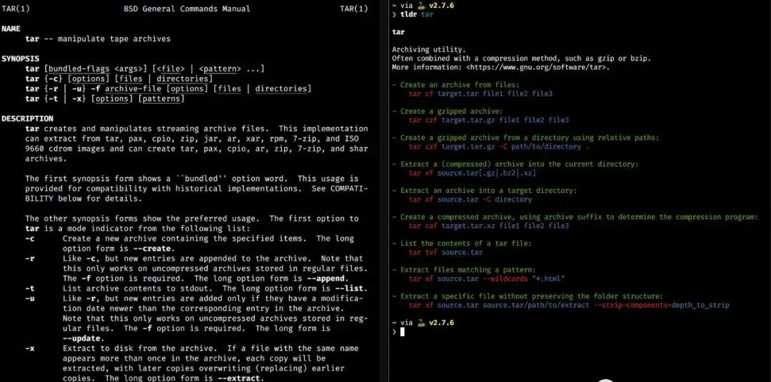 “man pages”展示的信息太全面了,但是很多时候使用tldr可以更快地帮你找到特定信息,这才是用户真正想要的。