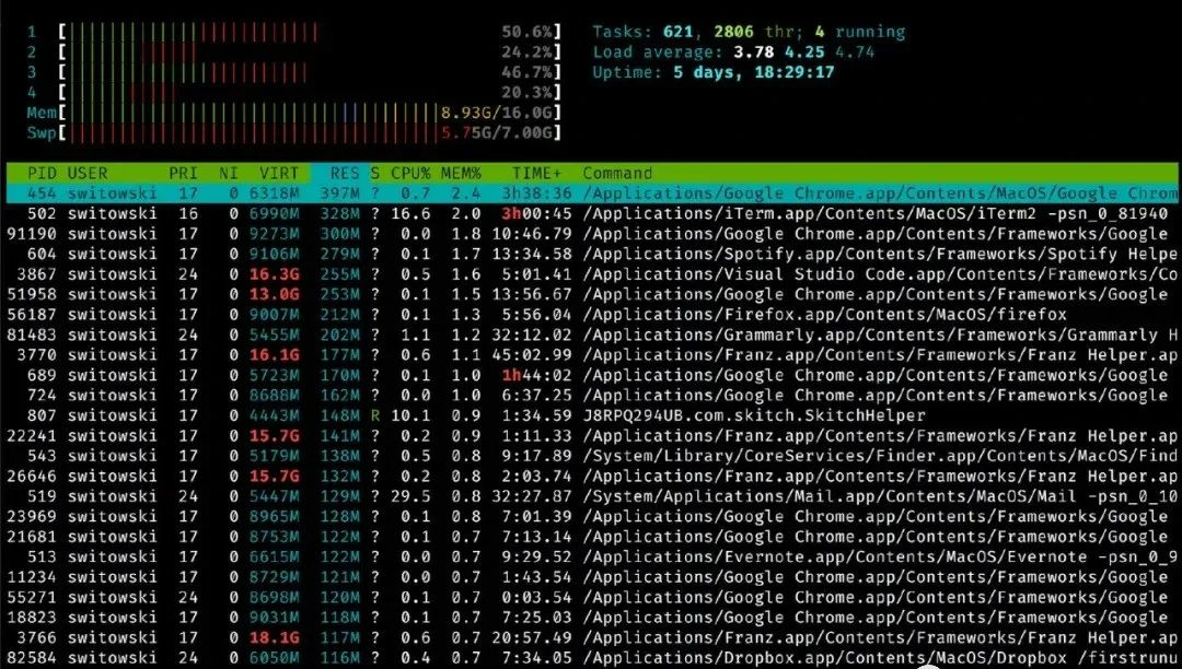 top工具是非常基础的监控工具,提供的功能有限,因此很多人转去使用 htop。htop比起top,优势很明显——除了功能更加完善以外,它的色彩搭配也很丰富,整体上使用起来更加友好。