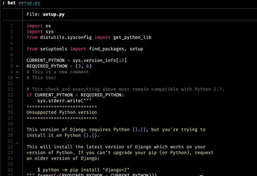 它增加了语法高亮显示,git gutter 标记(如果适用),自动分页(如果文件很大)等功能,并且使得输出的内容阅读起来更加友好。