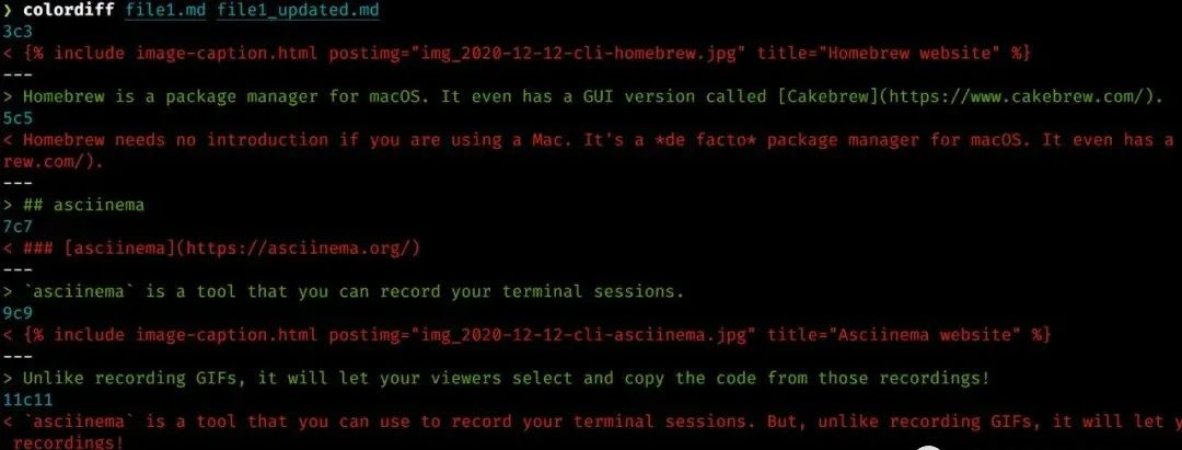 如果想在终端中使用diff操作(比较两个文件之间的差异),可以放弃使用diff命令,而是使用 colordiff。colordiff输出可以高亮显示,因此在查看文件差异内容时要方便得多,而不是在diff命令输出内容下,费力地查看所有的“ <”和“>”符号来对比文件差异。