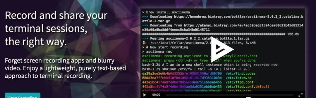 asciinema是可用于记录终端会话的工具。但是,与录制 GIF 不同,它可以让用户选择并复制这些录制中的代码!这对于录制编码教程来说十分好用。asciinema录制的内容,支持直接复制,十分给力。