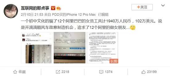 2月10日,据新浪微博网友爆料,一个初中文化水平男子开滴滴顺风车故意制造机会,追求了12个阿里女员工做女朋友,诈骗钱财共计1940万人民币,102万美元。