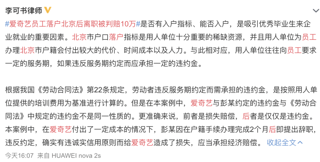 爱奇艺员工落户北京后离职被起诉,被判赔偿 10 万元