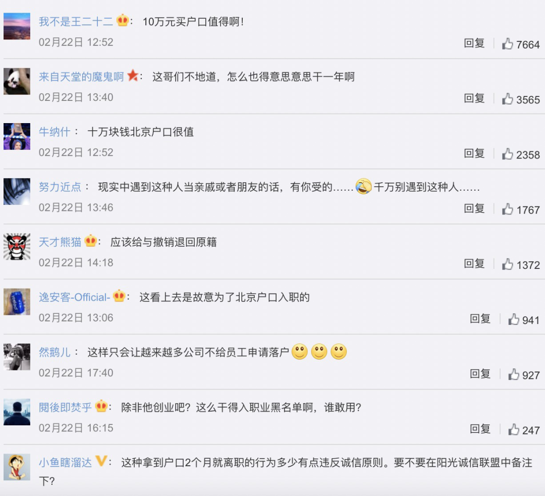 不少网友惊呼,“10万换北京户口血赚”。也有网友批评彭某“太不要脸,得了户口就辞职啊”。