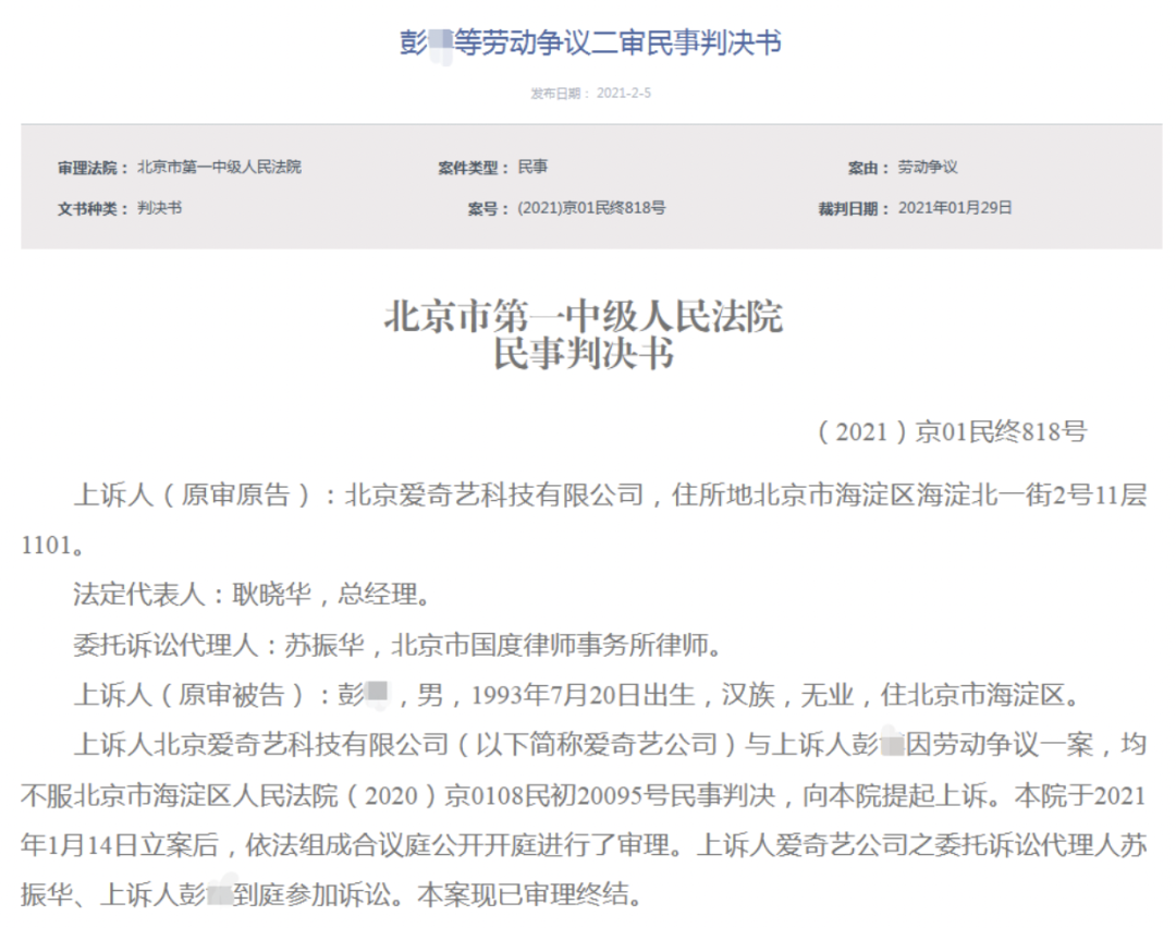 2月5日,北京法院审判信息网公开一份二审民事判决书,一位彭姓程序员与爱奇艺公司之间的劳动争议,北京市第一中级人民法院维持一审判决:彭某向爱奇艺公司赔偿损失 10 万元。