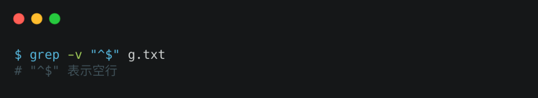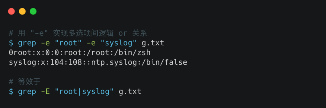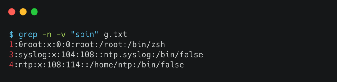 -A:除了匹配行,额外显示该行之后的N行-B:除了匹配行,额外显示该行之前的N行-C:除了匹配行,额外显示该行前后的N行-c:统计匹配的行数-e:实现多个选项间的逻辑 or 关系-E:支持扩展的正则表达式-F:相当于 fgrep-i:忽略大小写-n:显示匹配的行号-o:仅显示匹配到的字符串-q:安静模式,不输出任何信息,脚本中常用-s:不显示错误信息-v:显示不被匹配到的行-w:显示整个单词--color:以颜色突出显示匹配到的字符串