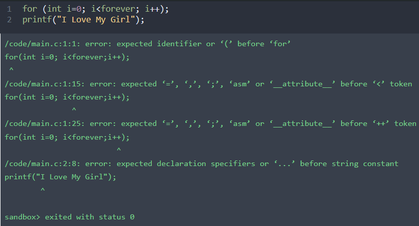 我稍作了修改,定义了变量 forever 和 i,还将 for 后面的分号改成了花括号。另外因为 forever 是个无穷大的正数,我就用 100 来简化代替吧。
