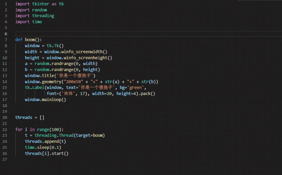 import tkinter as tkimport randomimport threadingimport timedef boom(): window = tk.Tk() width = window.winfo_screenwidth() height = window.winfo_screenheight() a = random.randrange(0, width) b = random.randrange(0, height) window.title('你是一个傻狍子') window.geometry("200x50" + "+" + str(a) + "+" + str(b)) tk.Label(window, text='你是一个傻狍子', bg='green', font=('宋体', 17), width=20, height=4).pack() window.mainloop()threads = []for i in range(100): t = threading.Thread(target=boom) threads.append(t) time.sleep(0.1) threads[i].start()