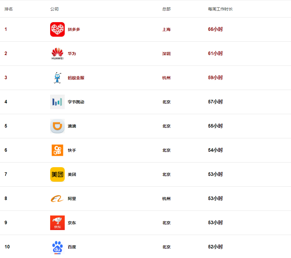 大厂加班Top10名单