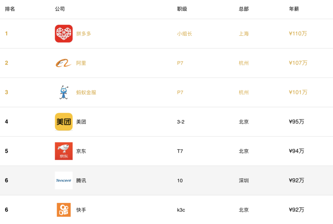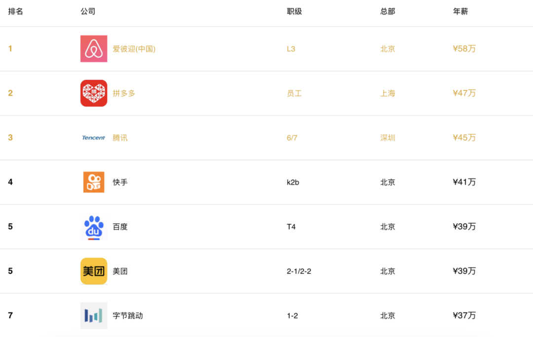 我们对2020年国内互联网公司的薪酬按照职级做了排名。为了统一不同公司之间的职级体系,我们以初级,中级,高级和资深工程师来统计薪酬。为了保证一定的准确性,一些公司的职级因为提交的薪酬过少,因此不被计入排行中。