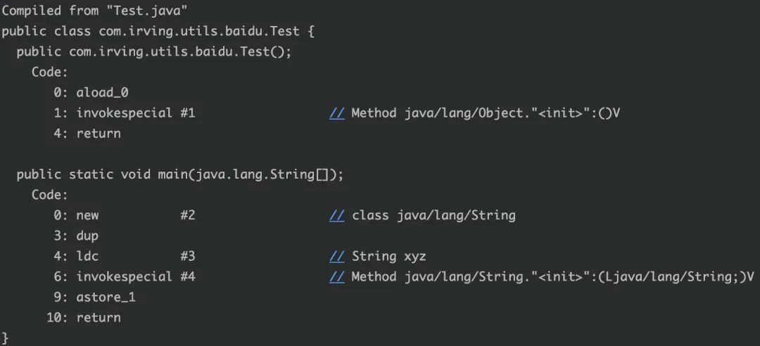 很明显,我们看到new 创建了一个String对象,同时ldc在常量池中创建了"xyz"字符串对象,之后invokespecial执行构造函数,astore_1赋值,return返回。
