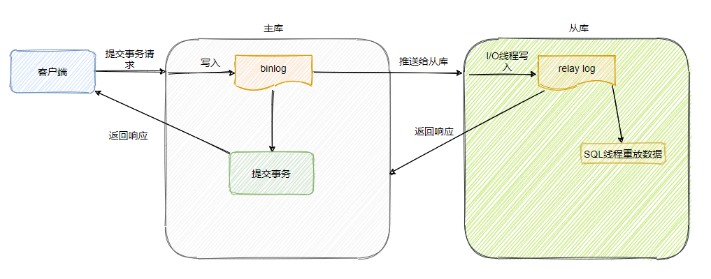 用一句话概括一下:主库提交事务会写binlog,会由一个 dump 线程推送给从库,从库接受之后会有一个I/O线程将其写到 relay log 中,慢慢消化,由 SQL 线程来重放更新数据。