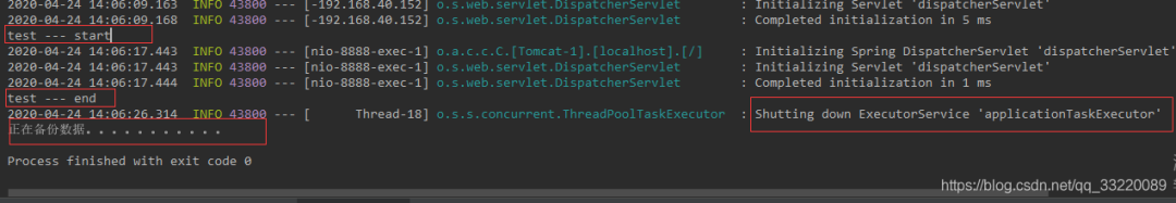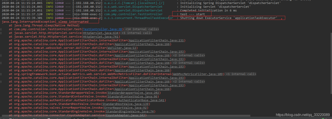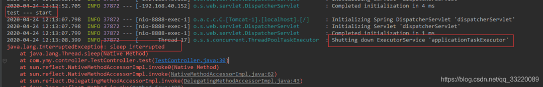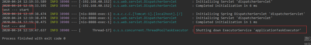 test — end 被执行了,不过在停止线程池的时候还是调用了线程的 interrupt 方法,导致 sleep 报错,这三种方式都可以比较优雅的停止 SpringBoot 服务。