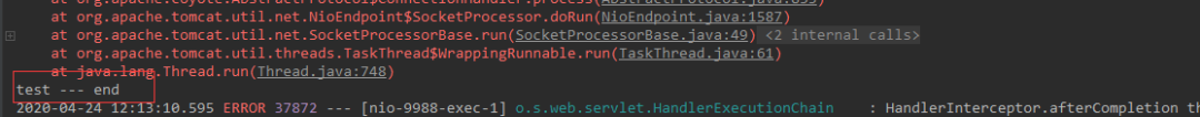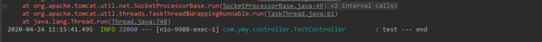 2020-04-24 10:54:04.574 INFO 14086 --- [nio-9988-exec-1] com.ymy.controller.TestController : test --- end