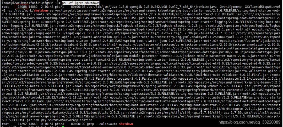 这个就是项目的进程号,接下来我们先测试 test 接口,让线程进入休眠状态,然后再使用 kill -15 14086 停止项目: