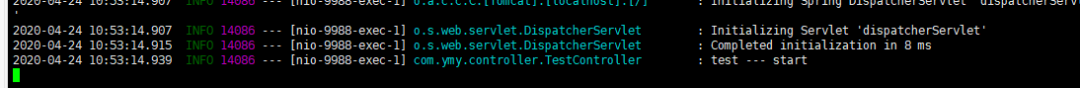 2020-04-24 10:53:14.939 INFO 14086 --- [nio-9988-exec-1] com.ymy.controller.TestController : test --- start