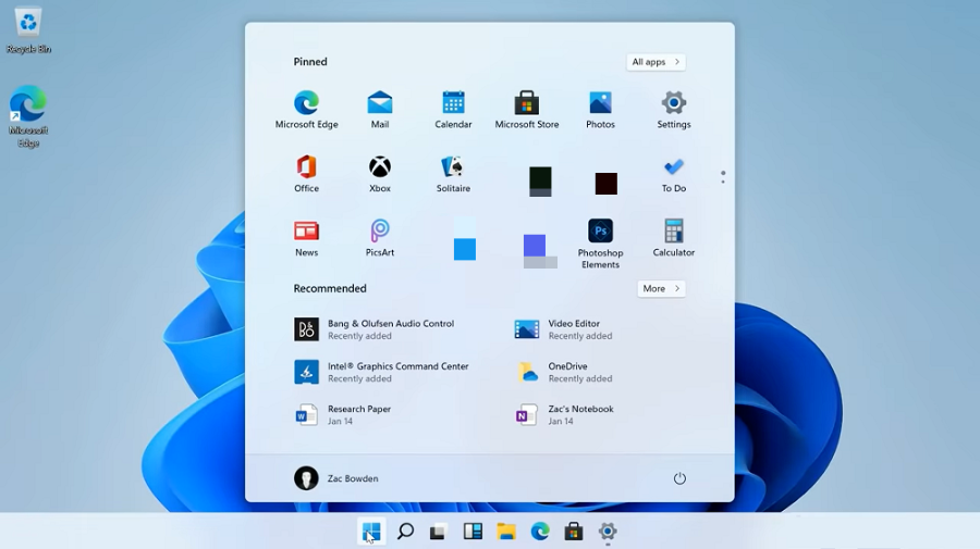 Windows 11的开始菜单里,磁贴设计不见了。从上到下分别是软件库、建议、个人账户和开关机选项。