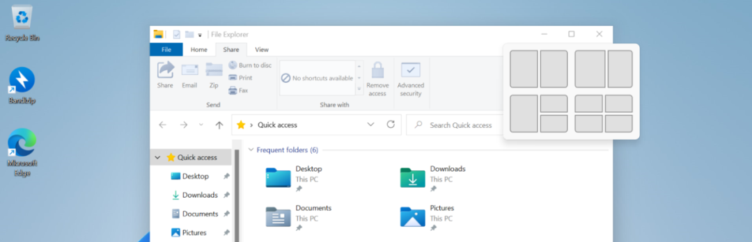 首先来看分屏操作的变化。Windows 11的窗口提供了多种排列的方式,操作很便捷,只需右键全屏化的按钮,或将光标移动至其上层稍作停顿,便可触发分屏机制。